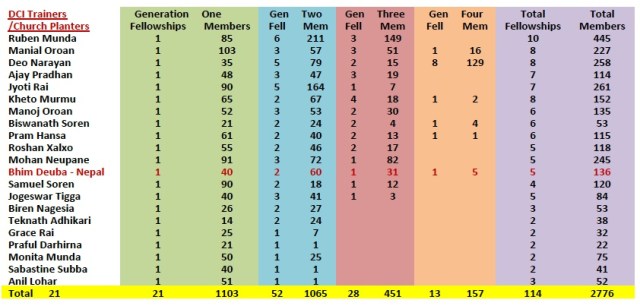 Moala Kashung shares: “Lots of love to you from the DCI family in India. Nepal, Bangladesh and Myanmar. We are all giving our best for the extension of God’s kingdom in our respective countries. We keep in touch with each other and share our successes and failures, prayer concerns and encourage each other. What a lovely family of DCI! In this spreadsheet below you will come across the name Bhim Deuba of Nepal. Once, he was the Chief of the Maoist Party rebel group against the Monarchy in Nepal. By his own hand, sword (khukri) and gun he murdered hundreds of people. God dramatically caught him to be his messenger in Nepal. God connected us and encouraged us to work together with him for God’s kingdom. Our first step was to bring him to our office and train him in the DCI strategy. So, we have done that successfully and effectively. He has started the work and speedy progress is going on in Nepal. We have invited him to come to India every two months with his ministry report, sharing, prayer time and drawing his salary. We pay him Rs 5000 which is about $80.00 USD per month for his needs. We are compelled to scrape out from every possible hole. God is faithful! We are praying that God will raise up someone to provide! Thank you for your prayer and financial support for the DCI family in India.” The following shows the results of 21 recently sent out Church Planters. Notice that these are Churches (Fellowships) that have planted other churches up to 4 generations of churches. Members only are listed. Attendees would be many more.